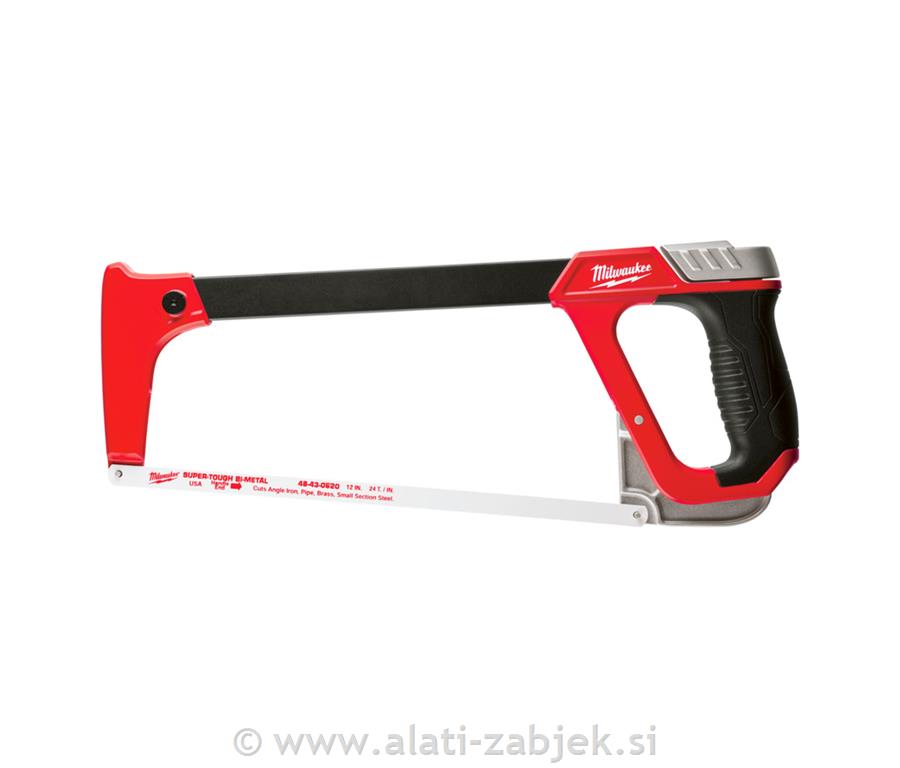 Opis proizvoda - Robustno kovinsko ogrodje omogoča višjo napetost (25.000 PSI / 250 lbs) - Ročaj z oblitjem zagotavlja varen oprijem in udobje pri uporabi - Notranji prostor za shranjevanje dodatnih rezil - Priloženo rezilo 12˝ / 24 TPI - Primeren za rezila do dolžine 12˝