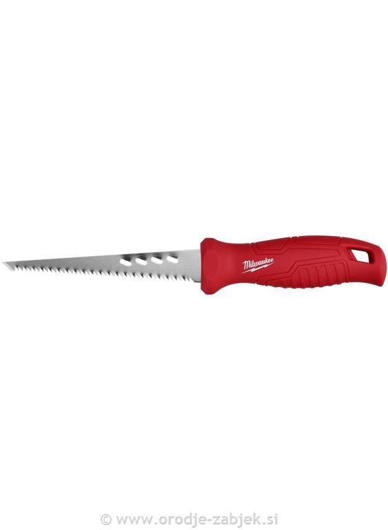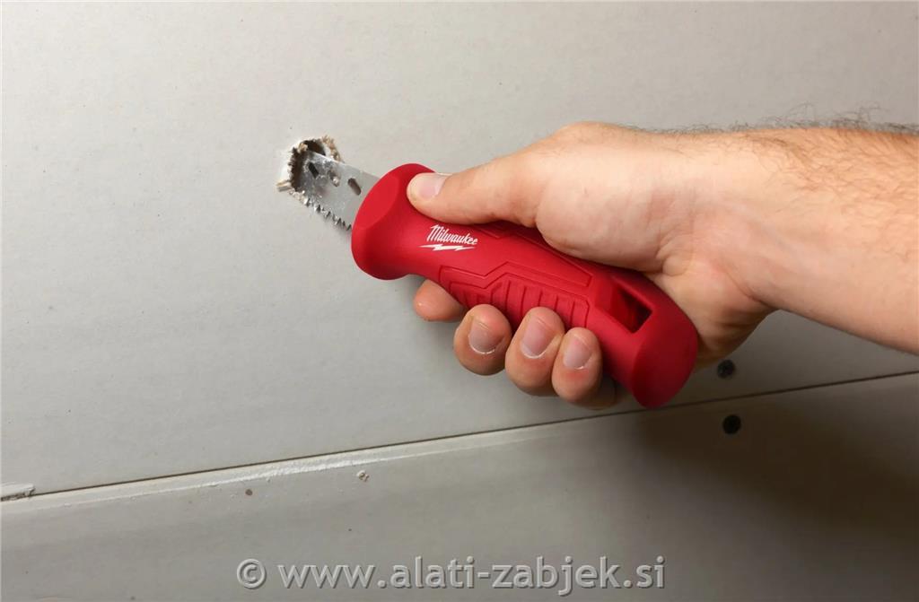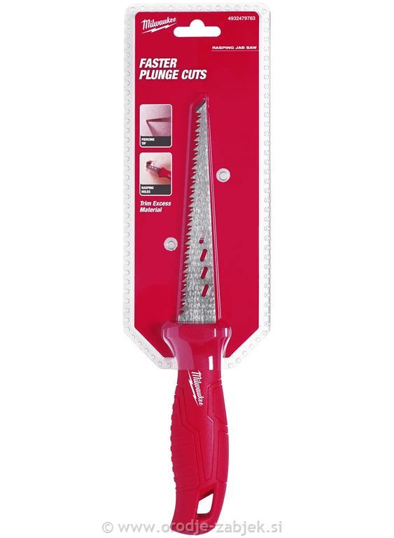 Opis proizvoda - vgrajene rašplaste luknje: Omogoča hitro povečanje lukenj ali glajenje grobih robov - ročaj prevlečen z gumo: Izjemno udobje in manjše drsenje rok - rezilo 150 mm za mavčne plošče ali suhomontažne stene - izredno močno rezilo, odporno za potopno rezanje - površinsko obdelano za zaščito pred rjavenjem