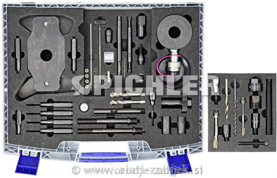 For removing frozen common rail injectors from the cylinder head using 20 tons hollow piston cylinder. In case the injector breaks off during pulling on the lower screw connection can the additional pull spindles be used to pull out the rest of the injector.