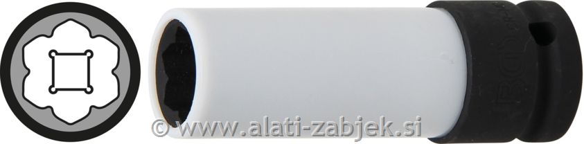 Opis proizvoda Opis: - primerna za ročne in udarne ključe - se lahko pritrdi na udarni ključ z zatičem in O-obročem - s plastičnim pokrovom za popolno zaščito aluminijastih platišč - poseben profil za Mercedes Benz - velikost ključa: MS 17 mm - dolžina: 85 mm