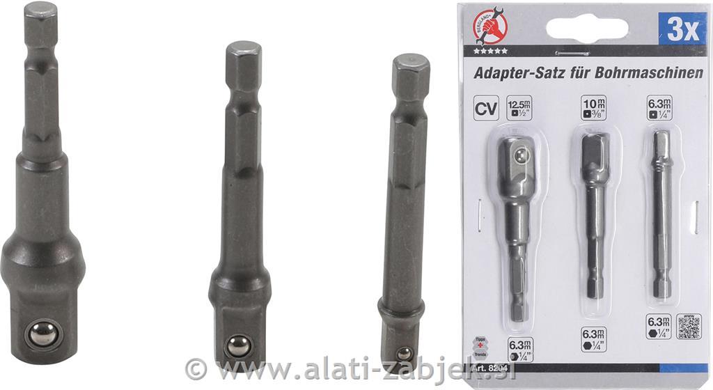 Opis proizvoda - 3 adapterji reducirji 1/4 " , 3/8 ", 1/2 "kvadrat glava , vsaka s kroglasto glavo - Primerna za uporabo na električnih vijačnikih , 1/4 " šestkotnim vpetjem - dolžine 75 mm - peskan