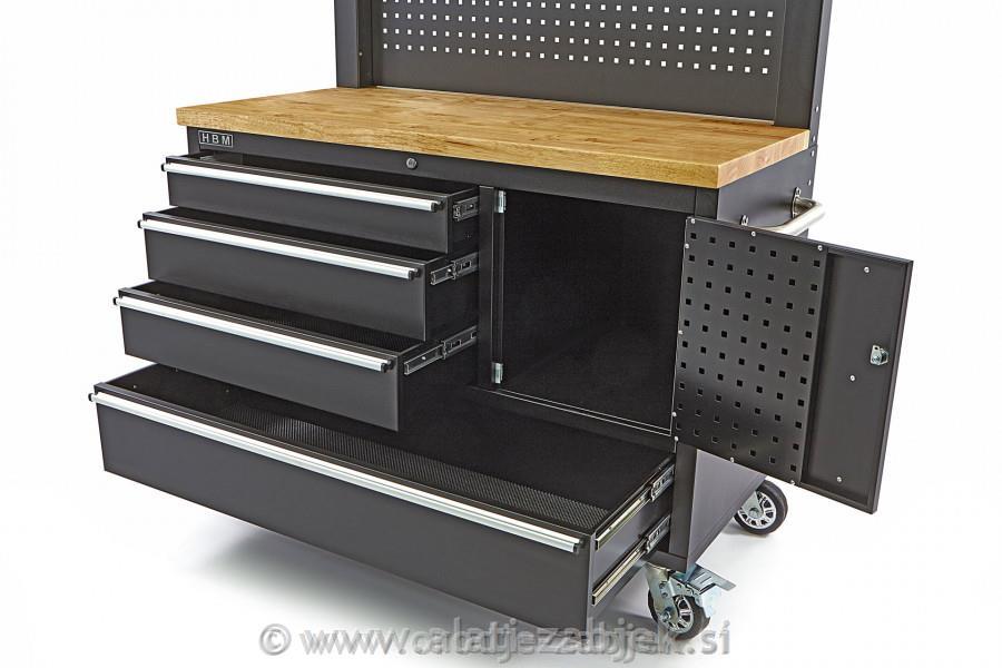Trdno stoji na štirih vrtljivih kolesih 125 x 40 mm, od katerih imata dve zavori