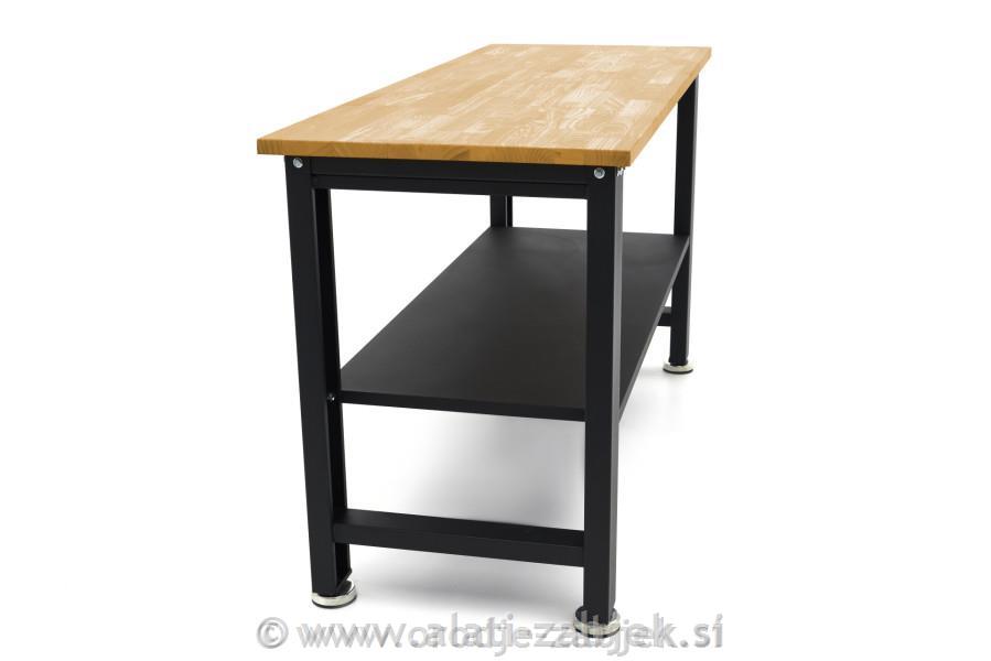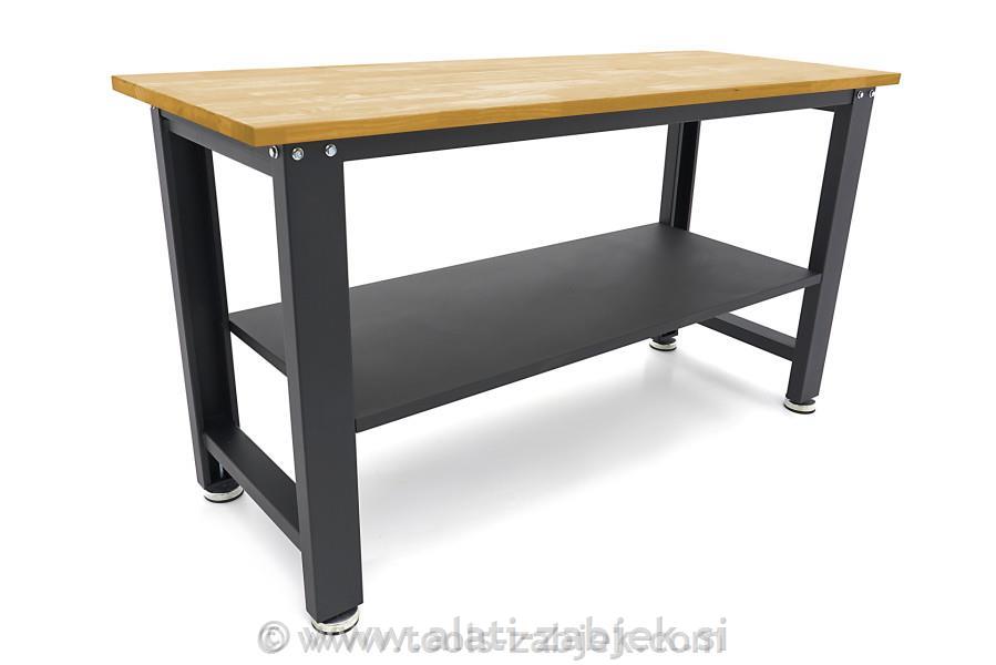 Profesionalna delovna miza s trdno leseno delovno ploščo je rešitev, če delate s težkimi obdelovanci. Delovna miza ima nastavljive noge, ki zagotavljajo nastavitev delovne mize na želeno višino. Masivna lesena delovna plošča zagotavlja, da lahko nanjo brez težav odložite težke obdelovance in orodje.
