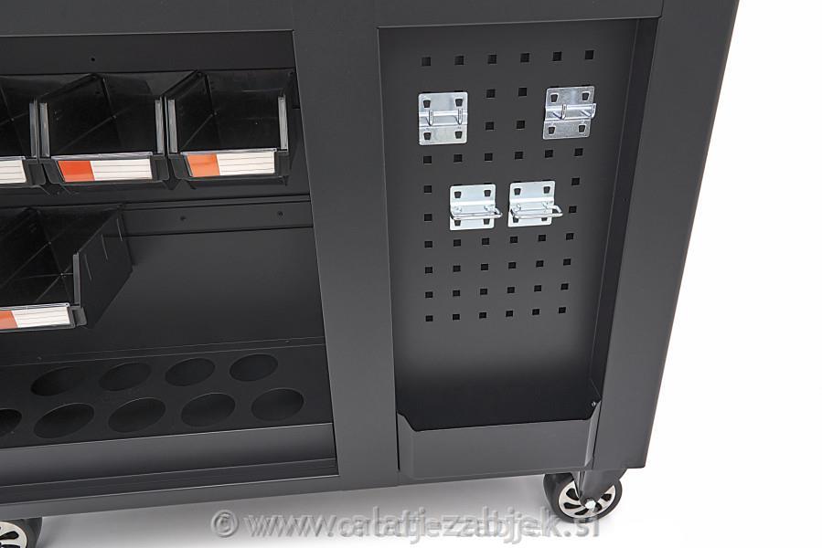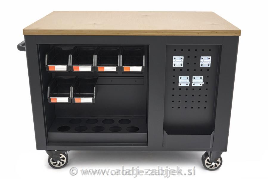 Mobilni voziček za orodje in delovna miza je visokokakovosten izdelek, ki je zasnovan tako, da nudi možnosti shranjevanja in dela. Ima robustno leseno delovno ploščo, ki je kot nalašč za različna dela in ponuja veliko prostora za organizacijo vašega orodja in materialov.