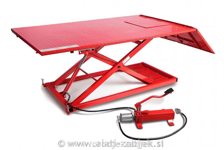 Ta robustna dvižna miza je idealna za servisiranje motornih koles, štirikolesnikov in drugih manjših vozil. Omogoča varno in stabilno delo zahvaljujoč visoki nosilnosti in velikim dimenzijam delovne površine.