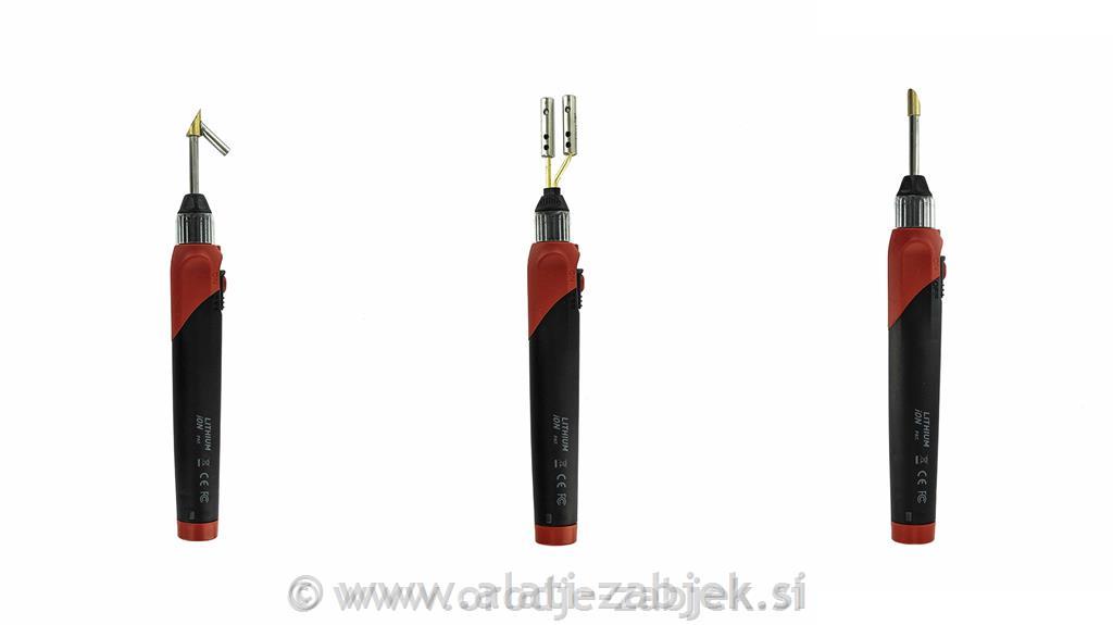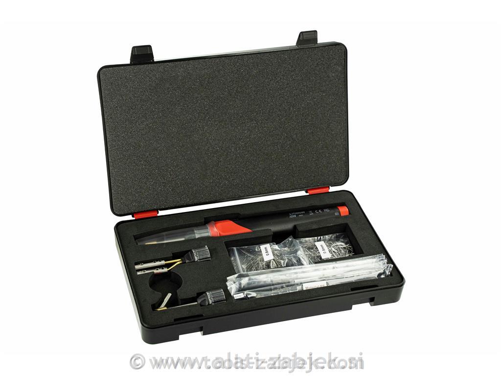 • set vključuje: konico za vroče sponke, plastično varilno konico (maks temp. 500°C), plastična varilna konica z vodilom za varilno palico, 12 plastične varilne palice 150mm (ABS,PP,PE,PS), 3kom nerjaveče jeklene žičnate mreže (50 x 100 mm) in sponke iz ravnega legiranega jekla (50 kosov 0,8 mm & 50 kosov 0,6 mm).