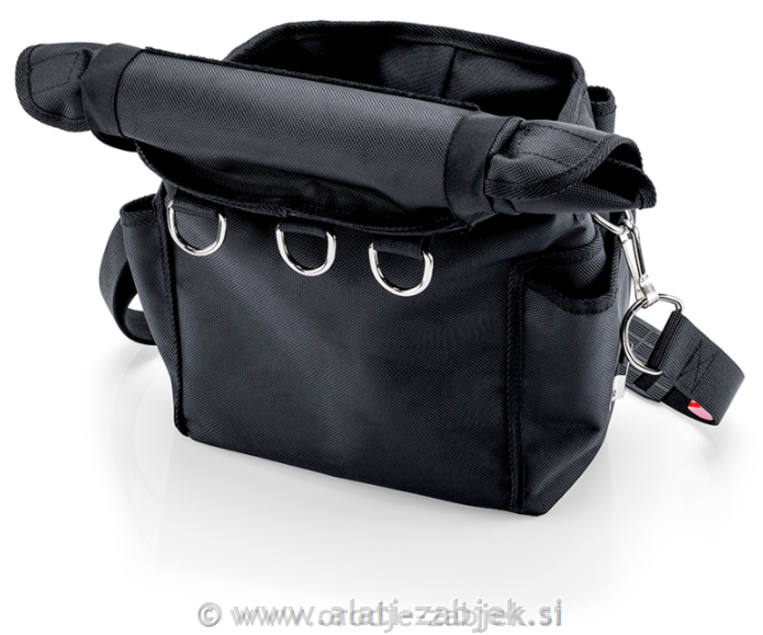 - 11 jeklenih D-obročev: 8 za pritrditev privezanega orodja in 3 za pritrditev torbe na plezalno opremo