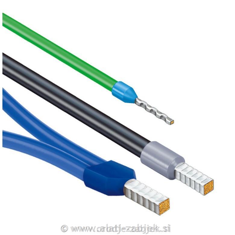 Hitro in natančno kvadratno stiskanje enožičnih obrob v skladu z DIN 46228 deli 1+4, samonastavljivo za velikosti 0,25 – 4 mm² / 2 x 2,5 mm² – omogoča hitro stiskanje med različnimi velikostmi.