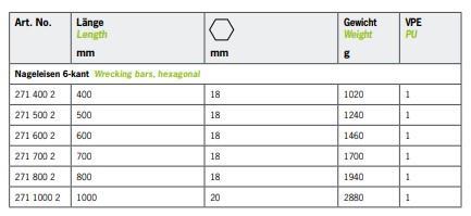Opis proizvoda - služi tudi kot sredstvo za puljenje žebljev - profil ovalni - do 50% večja odpornost proti upogibu v primerjavi s šestkotnim profilom z enako težo - posebno orodno jeklo, kovano - delovni robovi kaljeni - rdeče prašno prevlečen - šesterokotni : 20 mm