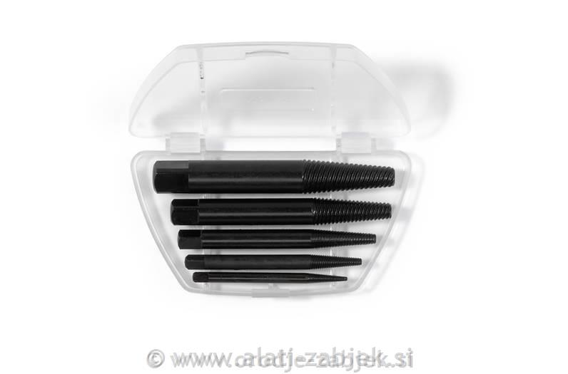 5 delni set za odstranjevanje poškodovanih vijakov. Vijaki v plastičnem etuiju z različnimi velikostmi svedra. Primerni za desne ali leve navoje