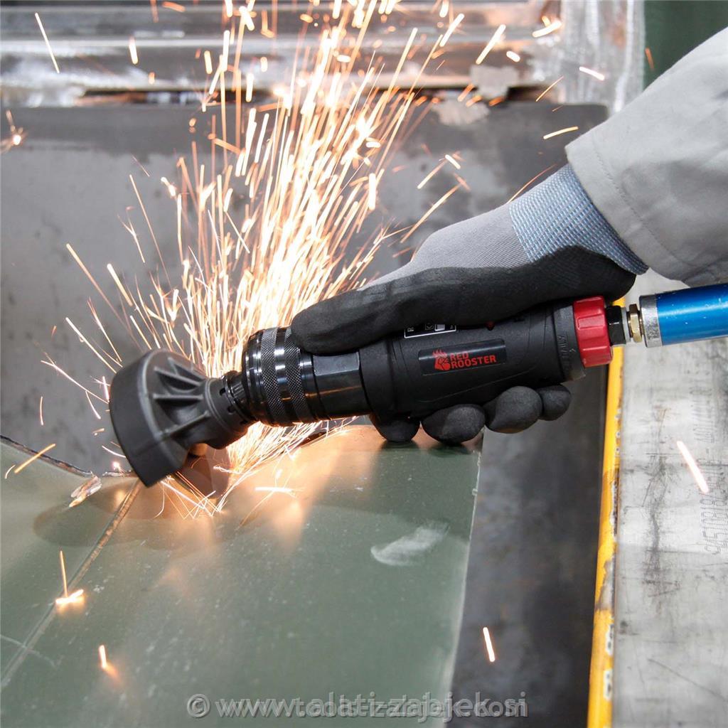 Pnevmatski rezalnik RED ROOSTER uporablja s 75 mm rezalnie plošče. Brusilno glavo lahko nagnete pod kotom 25 stopinj v 2 položajih. S to nagibno glavo so težko dostopna mesta bolj dostopna, kar poveča ergonomske lastnosti in vam omogoča uporabo visoko natančnega brušenja. To orodje ima zelo močan zračni motor s 600 W. Zelo primeren za natančno rezanje na primer jeklene pločevine, karoserijskih delov in izpušnih cevi.