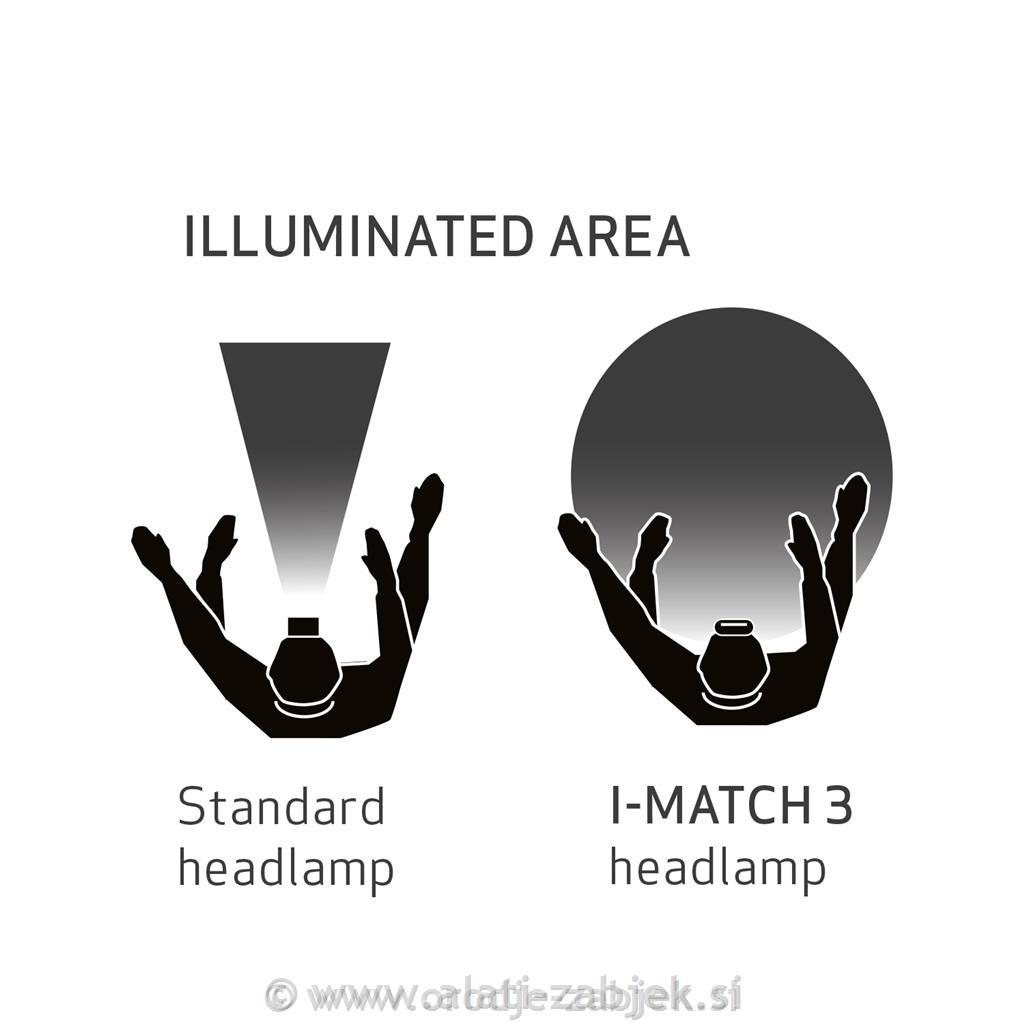 Čelna svetilka I-MATCH 3 z možnostjo polnjenja, ki je opremljena z najnovejšo tehnologijo COB LED, zagotavlja izjemno močno osvetlitev, ki maksimalno razširi enotno svetlobo in osvetli vaše celotno vidno polje.