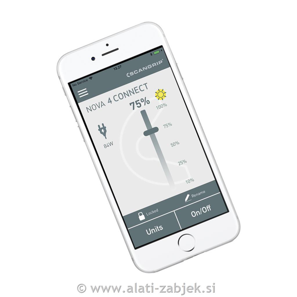 Z uporabniku prijazno aplikacijo za nadzor luči BLUETOOTH dobite izjemno možnost vklopa/izklopa in upravljanja do štirih delovnih luči preko mobilne naprave. Vgrajena funkcija zatemnitve vam omogoča nastavitev svetlobnega toka na pet različnih stopenj. Ta funkcija prihrani čas pri ročnem upravljanju in poveča vsakodnevno delovno učinkovitost. Zasnovan je z zaslonom za prikaz zmogljivosti baterije in izhodne ravni lumnov ter je opremljen z vgrajenim napajalnikom. NOVA 4 CONNECT je izjemno trden in vodotesen (IP65). Zasnova je elegantna, z ročajem za prenašanje in stojalom za prilagodljivo pozicioniranje in neposredno montažo na TRIPOD SCANGRIP.