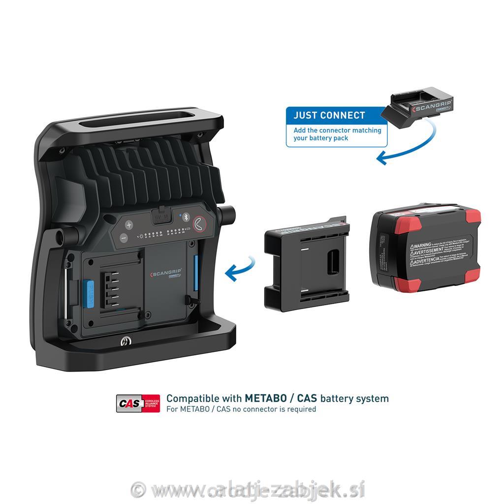 NOVA 4 CONNECT je izjemno robustna baterijska delovna luč, ki je združljiva z baterijskim sistemom METABO/CAS 12V 4,0 Ah - 18V 5,2 Ah in vsemi drugimi 18V baterijami vodilnih znamk električnih orodij, kot so Milwaukee tools, Dewalt tools, Makita tools itd. s scangrip prikjljučkom. Poleg tega lahko napajalnik SCANGRIP uporabite za neposredno napajanje, ki zagotavlja neomejeno razpoložljivost svetlobe. NOVA 4 CONNECT ima tudi notranjo rezervno baterijo, ki zagotavlja 2,5 dodatne ure pri 400 lumnih.