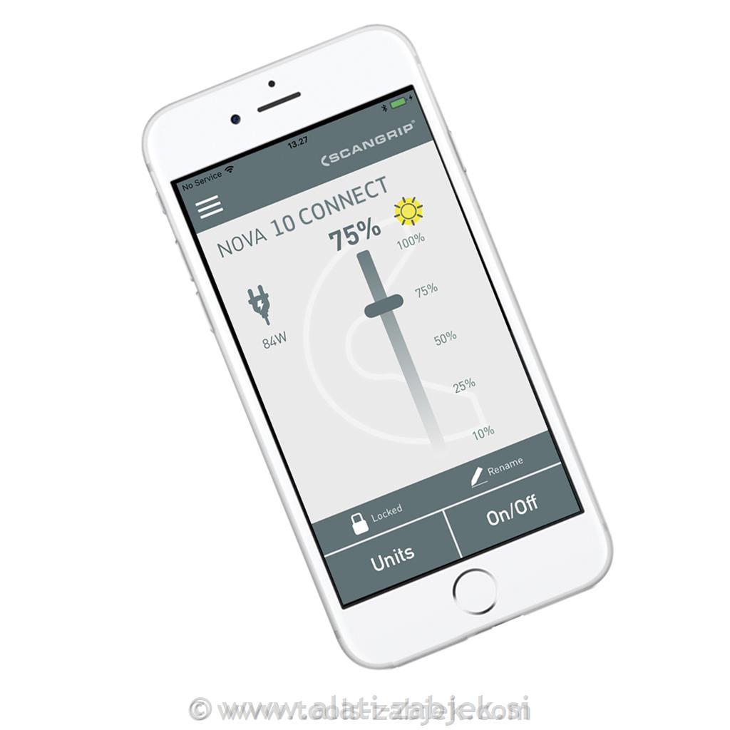 Z uporabniku prijazno aplikacijo za nadzor luči BLUETOOTH dobite izjemno možnost vklopa/izklopa in upravljanja do štirih delovnih luči preko mobilne naprave. Vgrajena funkcija zatemnitve vam omogoča nastavitev svetlobnega toka na pet različnih stopenj. Ta funkcija prihrani čas pri ročnem upravljanju in poveča vsakodnevno delovno učinkovitost. Zasnovan je z zaslonom za prikaz zmogljivosti baterije in izhodne ravni lumnov ter je opremljen z vgrajenim napajalnikom.
