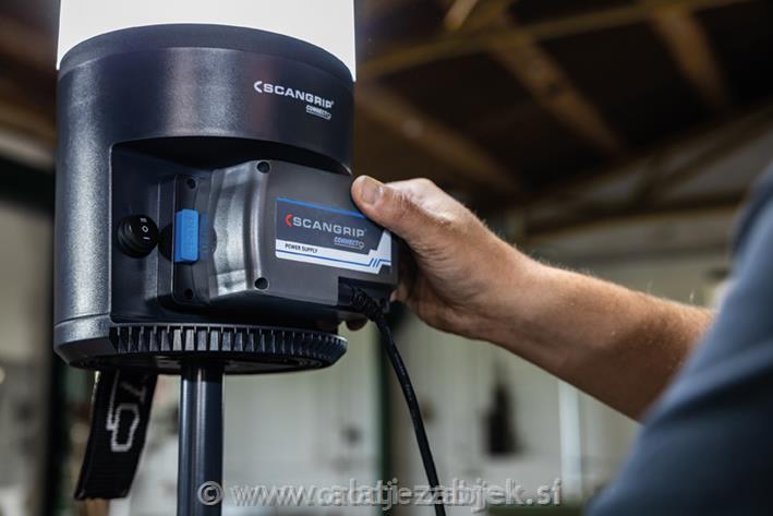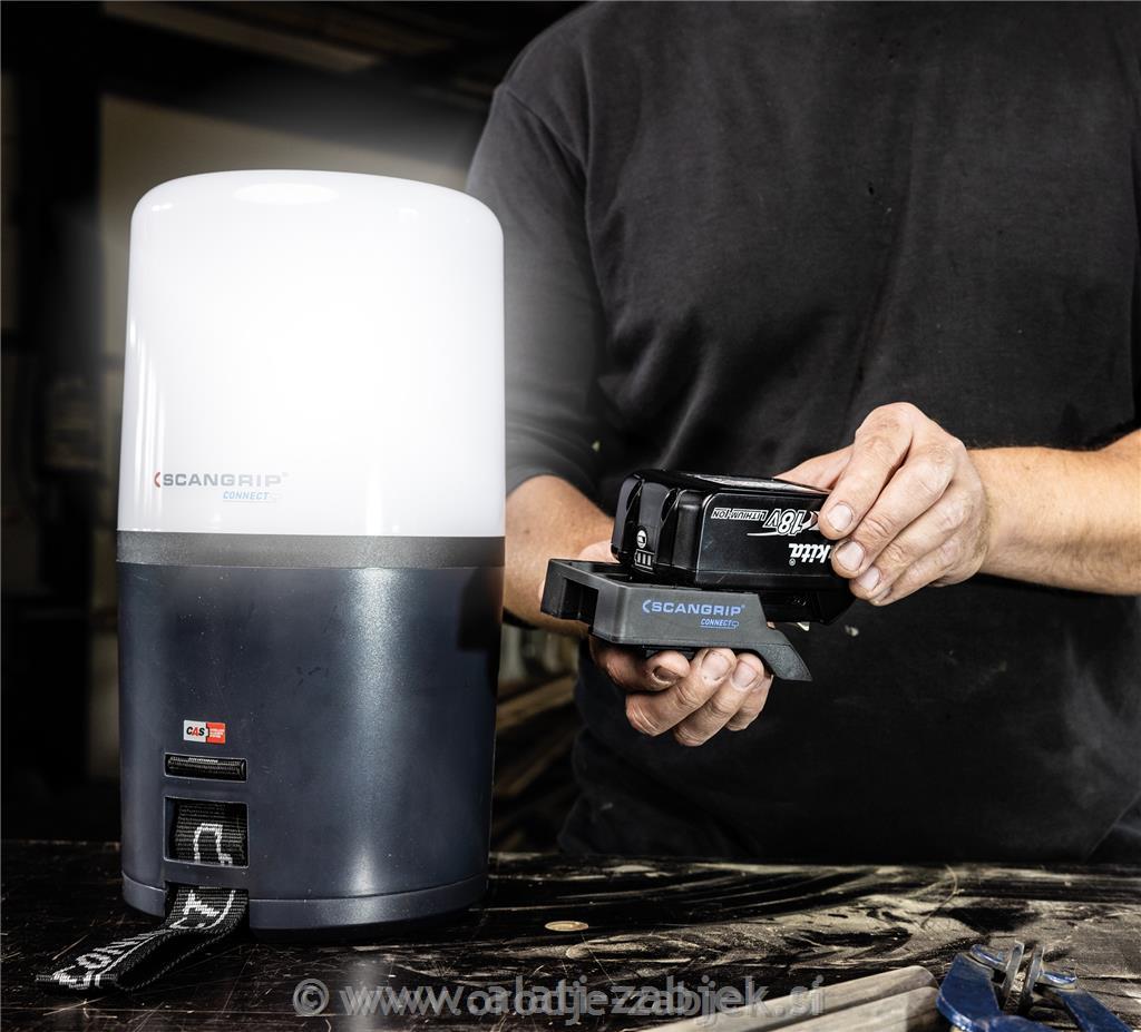 AREA 6 CONNECT je baterijska delovna luč, ki je združljiva z baterijskim sistemom METABO / CAS 18 V 5,2 Ah in vsemi drugimi 18 V baterijskimi paketi vodilnih blagovnih znamk električnih orodij z uporabo PRIKLJUČKA SCANGRIP. Poleg tega lahko napajalnik SCANGRIP uporabite za neposredno napajanje, ki zagotavlja neomejeno razpoložljivost svetlobe.