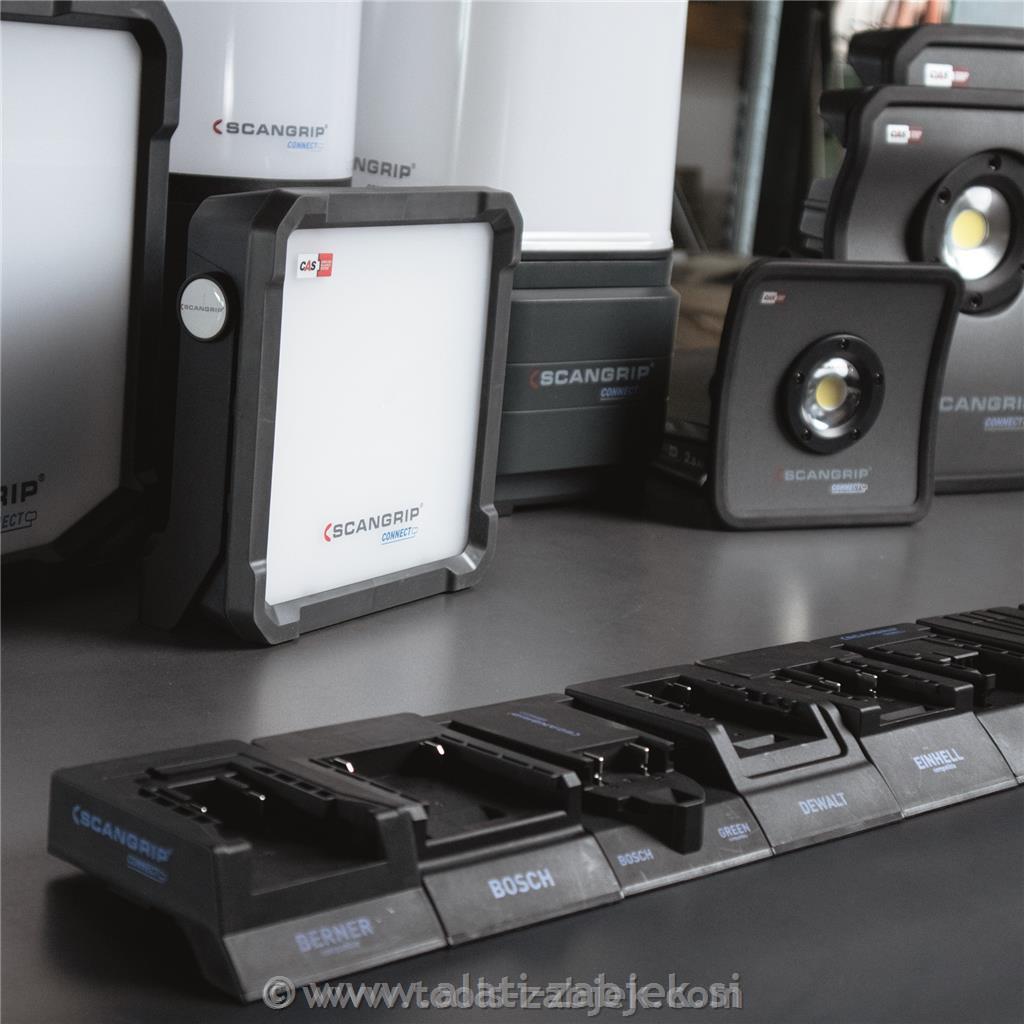 Pametni PRIKLJUČEK, zasnovan za uporabo 18 V baterijskih paketov na delovnih lučeh SCANGRIP CONNECT.