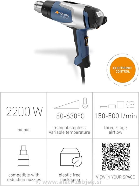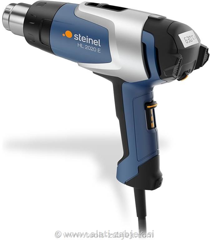 Pištola na vroč zrak Steinel HL 2020 E - 2200W Brezstopenjsko nastavljiva-Mojstrski razred. Elektronsko krmiljena toplozračna pištola 2020 E z LCD zaslonom. Profesionalna tehnologija za oblikovanje, odspajkanje tiskanih vezij, varjenje plastike, sušenje polnila, krčenje kablov, spajkanje cevi itd. S krmilno palico je mogoče nastaviti od 80 °C do 630 °C v korakih po 10 °C. Zaščita s prikazom preostale toplote.Tehnični podatki: