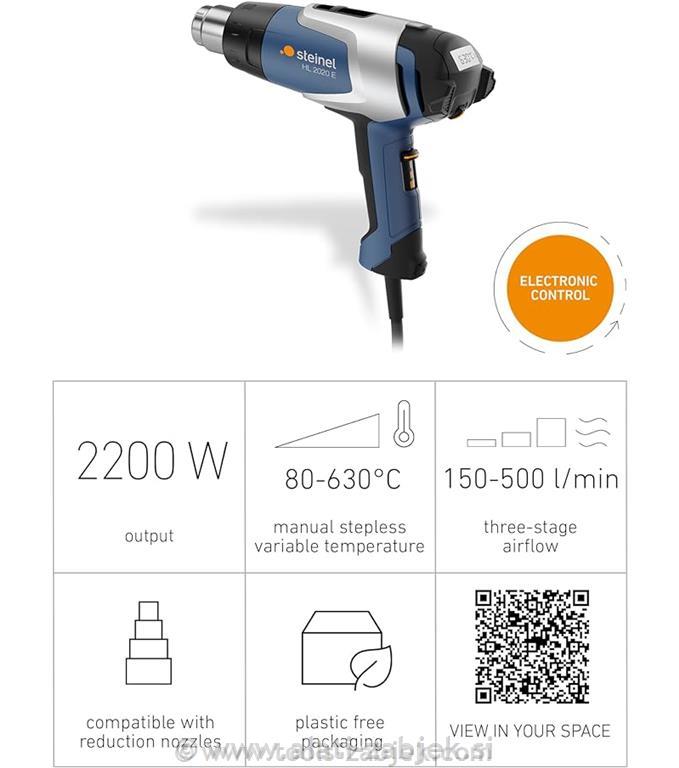 Pištola na vroč zrak HL 2020 E je izredno robustna in zato obljublja 20 % daljšo življenjsko dobo kot njena predhodnica. Profesionalni dodatki: Indikator preostale toplote opozarja na nevarnost opeklin na izpihovalni cevi, tudi če je bil vtič že dolgo izklopljen. Joystick pa omogoča intuitivno upravljanje in delo. Ko smo že pri delu: Hot Air Professional HL 2020 E je zasnovan za vse šobe STEINEL in je s temperaturami do 630° C idealno orodje za oblikovanje, odspajkanje tiskanih vezij, varjenje plastike, sušenje polnila, krčenje kablov, spajkanje cevi in druga opravila, ki zahtevajo visoko stopnjo natančnosti, zahtevajo nastavljivo toploto in močan ventilator. Trenutna delovna temperatura in količina zraka sta prikazana na LCD zaslonu, ki je dobro berljiv v vseh svetlobnih pogojih. Če se naprava segreje, se naprava takoj odzove z opozorilnim trikotnikom, ki zasveti na zaslonu.Prednosti: LCD zaslon, prikaz preostale toplote za optimalno zaščito, ergonomsko upravljanje s krmilno palico, močnih 2200 vatov, nastavljiva od 80°C do 630°C v korakih po 10°C. Količina zraka se lahko dozira v treh stopnjah (150 / 150-300 / 300-500 l/min.). Po želji so na voljo filtri za fini prah in HL Scan za zaznavanje temperature na obdelovancu. Napajalni kabel lahko zamenjate v trenutku z uporabo odstranljivega pokrovčka v ročaju.