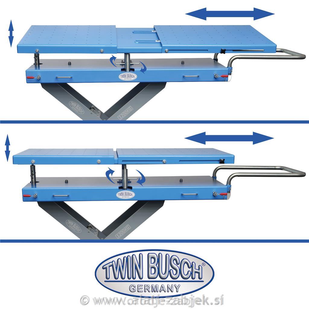 Profesionalna škarjasta dvižna miza 1200 kg, z 230 V elektrohidravličnim pogonom in dvojno hitrostjo dviga, kabelskim daljinskim upravljalnikom, nagibno ploščadjo z izvlekom.