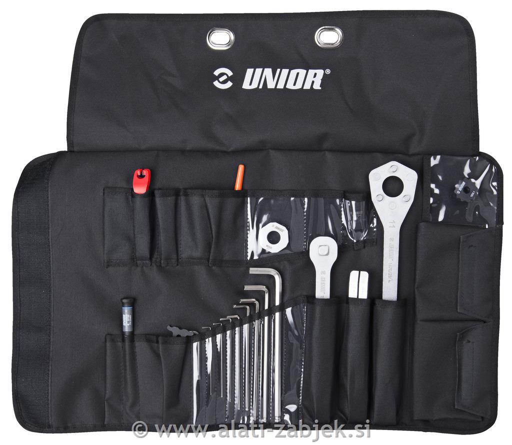 Uniorjeva profesionalna zložljiva torbica za orodje je dovolj velika za vsa orodja in dele, ki si jih želi imeti tehnično bolj podkovan kolesar vedno pri roki. Velikost in organizacija predalov bo všeč tudi profesionalnim mehanikom, zato ne bodite presenečeni, če boste te torbice videli v ekipnih avtomobilih na naslednji veliki etapni dirki ali v tehnični coni svetovnega pokala v gorskem kolesarstvu ali ciklokrosu. V tej verziji je torbica že napolnjena z naslednjim orodjem: