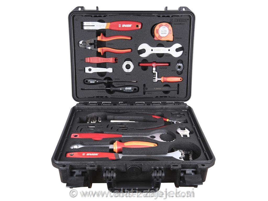 34 skrbno izbranih visokokakovostnih orodij Unior je dovolj za veliko več kot le osnovno vzdrževanje prav vsakega kolesa. Penasti pladnji z izrezi bodo poskrbeli, da bo orodje organizirano, medtem ko bo kovček, odporen proti prahu in vodi, poskrbel, da bo orodje vedno varno shranjeno. Priložen dodaten prazen pladenj iz pene daje prostor za personalizacijo kovčka za orodje, lahko ga razrežete, da vključite nekaj svojih najljubših orodij, ali odstranite za dodaten prostor za shranjevanje.