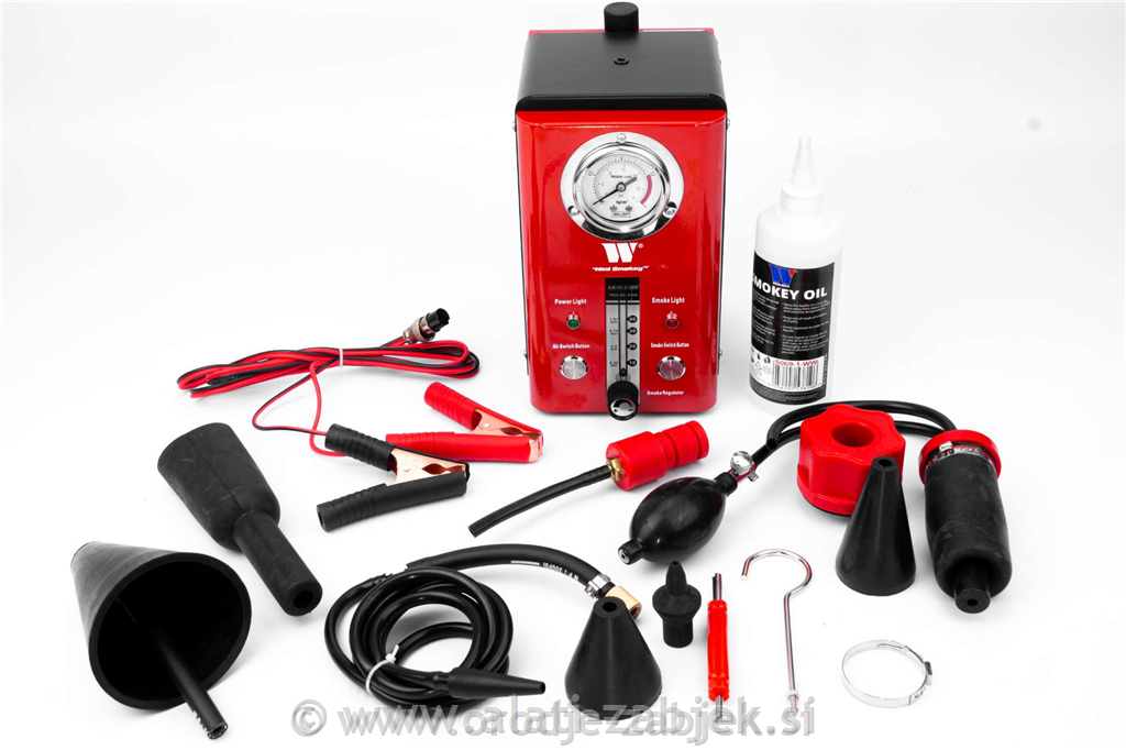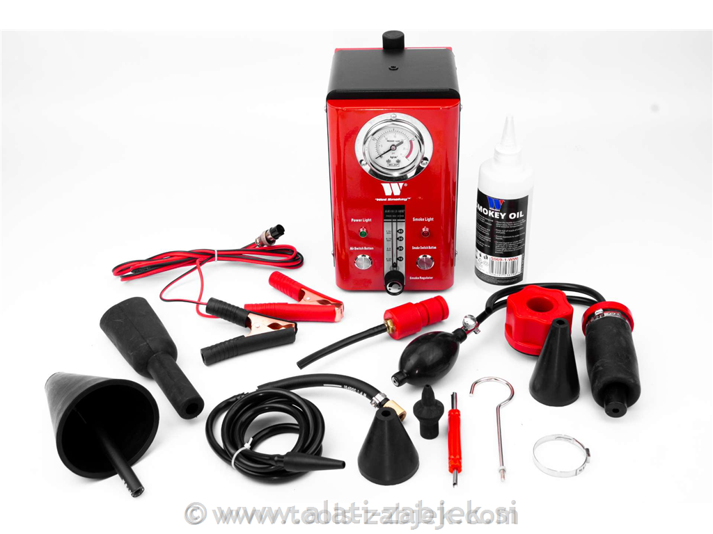 - kompaktni detektor dima za diagnostiko puščanja deluje na baterijo vozila DC12V, kar zagotavlja priročno in zanesljivo napajanje med postopki odkrivanja puščanja