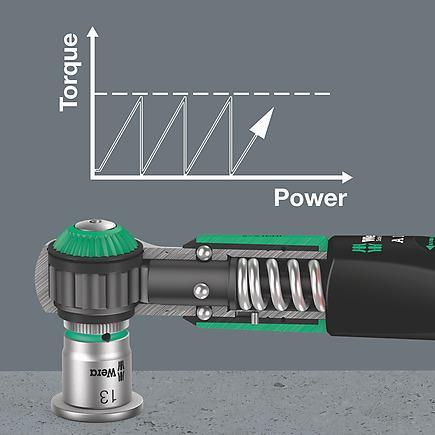 Momentni ključ z drsnim mehanizmom. Ko je nastavljeni navor dosežen, orodja ne morete preveč zategniti, tako da ni mogoče uporabiti prevelikega navora. Območje nastavitve od 2 do 12 Nm za nadzorovano delovanje navora v smeri urinega kazalca in nasprotni smeri urinega kazalca. Enostavna nastavitev in shranjevanje privzete vrednosti: Zvočni in taktilni kliki ob doseganju vrednosti skale olajšajo varno nastavitev želene vrednosti navora. S funkcijo Torque Lock za uporabo kot standardna raglja brez funkcije vrtilnega momenta. maks. prelomni moment glave ¼" po DIN 3122. Povratni kot samo 5° omogoča uporabo raglje tudi v zaprtih prostorih in torej tudi za aplikacije z zasučnimi koti.