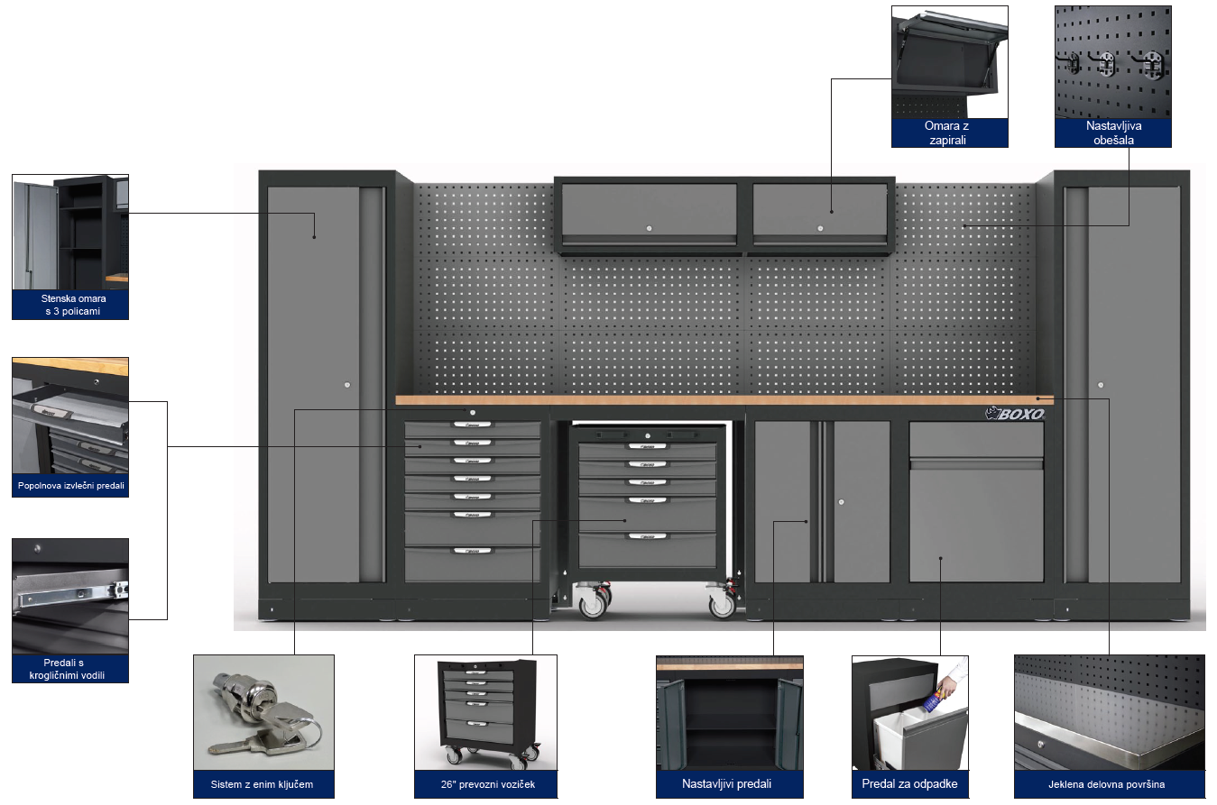 Nudimo vam različite mogućnosti nabave organiziranih sklopova za različite tipe radionica, bez obzira na djelatnost kojom se bavite. Boxo je priznati proizvođač kolica, organiziranih sklopova i drugog alata. Radioničke sklopove možete sastaviti po svojim željama, potrebama i mogućnostima. Za više informacija možete se obratiti našim prodajnim savjetnicima i zajedno ćete potražiti najbolje i najpovoljnije rješenje za vas. OSM konfigurator
