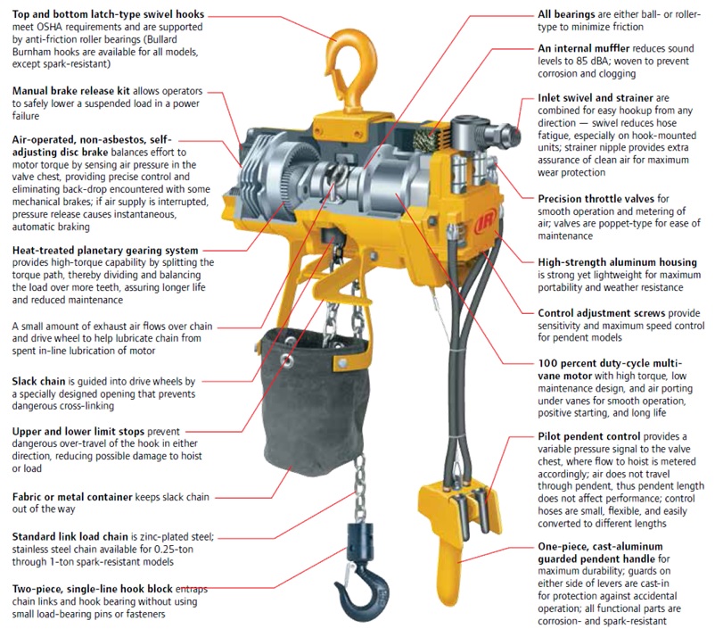 Ingersoll Rand pneumatske dizalice pružaju rješenja za podizanja u industriji širom svijeta od početka 19. stoljeća. Ingersoll Rand nudi širok izbor lančanih dizalica na pneumatski pogon. Ingersoll Rand u ponudi ima dizalice od 1/8 do 100 tona. U ponudi imamo dizalice za iznimno brze radne aplikacije, prehrambenu industriju, iznimno teška okruženja kao što su rudnici, brodogradilišta, elektrane, cementare, rafinerije i raznovrsne montažne linije. Ingersoll Rand dizalice imaju velik izbor dodataka.
